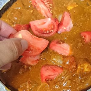 [8]煮込んで鶏肉によく火が通ったら、最後にトマトを入れてサッと煮込む。